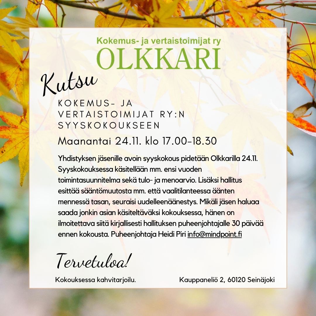 Yhdistyksen jäsenille avoin syyskokous pidetään Olkkarilla 24.11. Syyskokouksessa käsitellään mm. ensi vuoden toimintasuunnitelma sekä tulo- ja menoarvio. Lisäksi hallitus esittää sääntömuutosta mm. että vaalitilanteessa äänten mennessä tasan, seuraisi uudelleenäänestys. Mikäli jäsen haluaa saada jonkin asian käsiteltäväksi kokouksessa, hänen on ilmoitettava siitä kirjallisesti hallituksen puheenjohtajalle 30 päivää ennen kokousta. Puheenjohtaja Heidi Piri info@mindpoint.fi