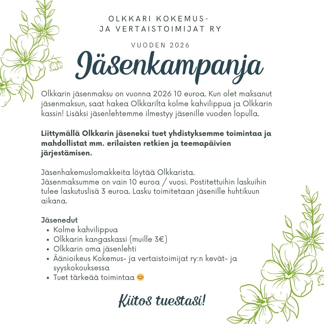Olkkarin jäsenmaksu on vuonna 2026 10 euroa. Kun olet maksanut jäsenmaksun, saat hakea Olkkarilta kolme kahvilippua ja Olkkarin kassin! Lisäksi jäsenlehtemme ilmestyy jäsenille vuoden lopulla.