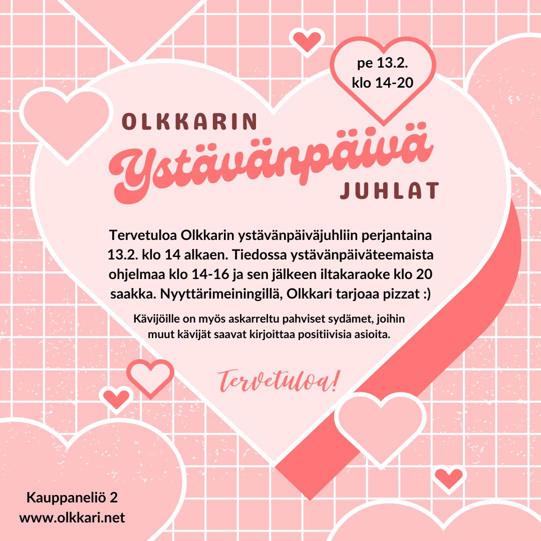 Tervetuloa Olkkarin ystävänpäiväjuhliin perjantaina 13.2. klo 14 alkaen. Tiedossa ystävänpäiväteemaista ohjelmaa klo 14-16 ja sen jälkeen iltakaraoke klo 20 saakka. Nyyttärimeiningillä, Olkkari tarjoaa pizzat 🙂